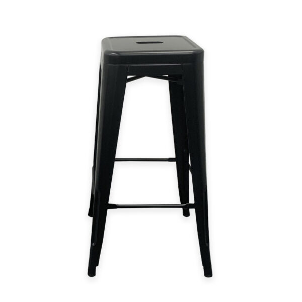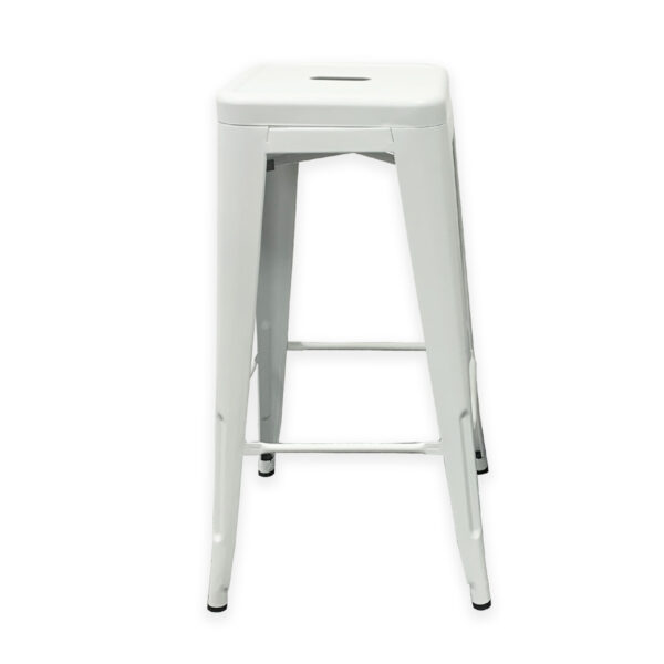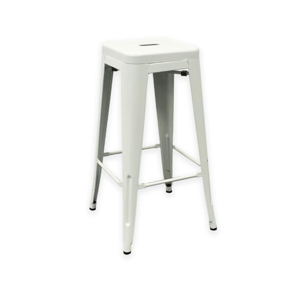 Tabouret de bar haut, cadre en acier blanc ou noir. Sellerie de qualité en simili cuir. Ce tabouret est empilable : piétement "gigogne" pour un stockage optimal.