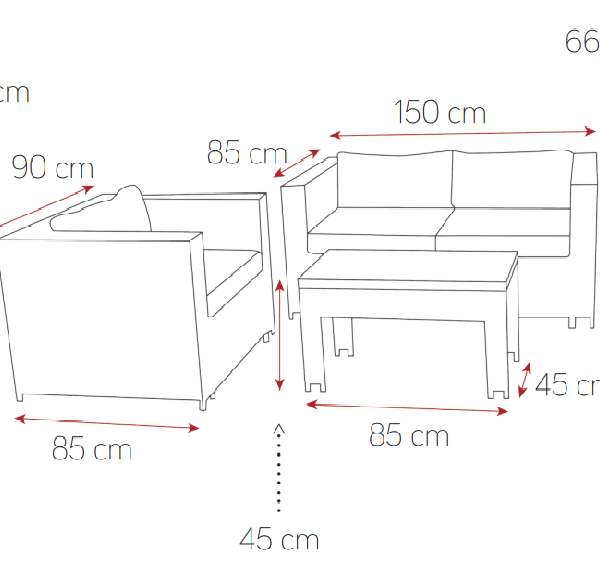 Ensemble composé d'un canapé, de deux fauteuils et d'une table basse avec plateau en verre 5 mm pour l'extérieur.