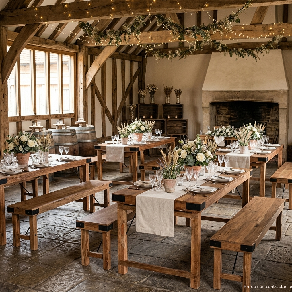 Le banc de ferme en bois massif apportera un charme rustique et chic à votre salle de mariage ambiance nature…