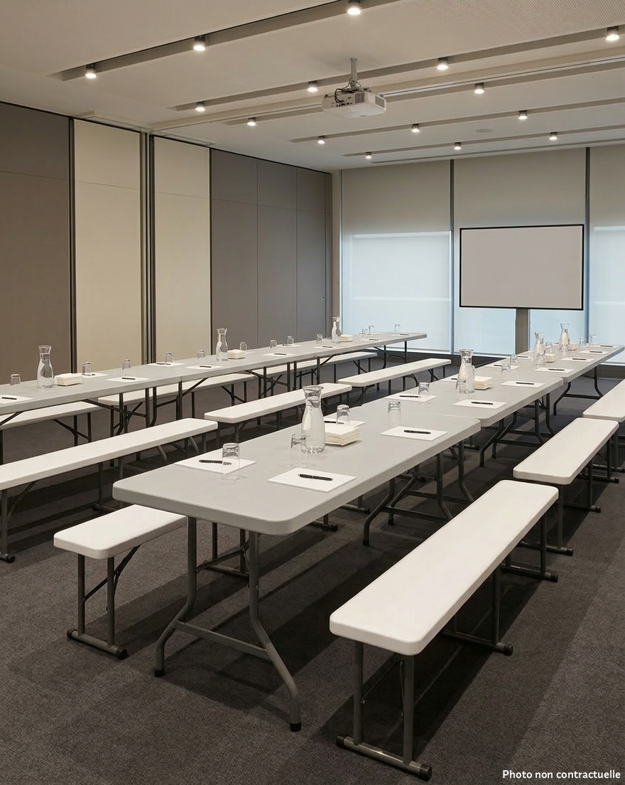 Banc en polyéthylène haute densité (hdpe). L’assise pliante et le piétement pliant réduisent la longueur nécessaire au stockage :
