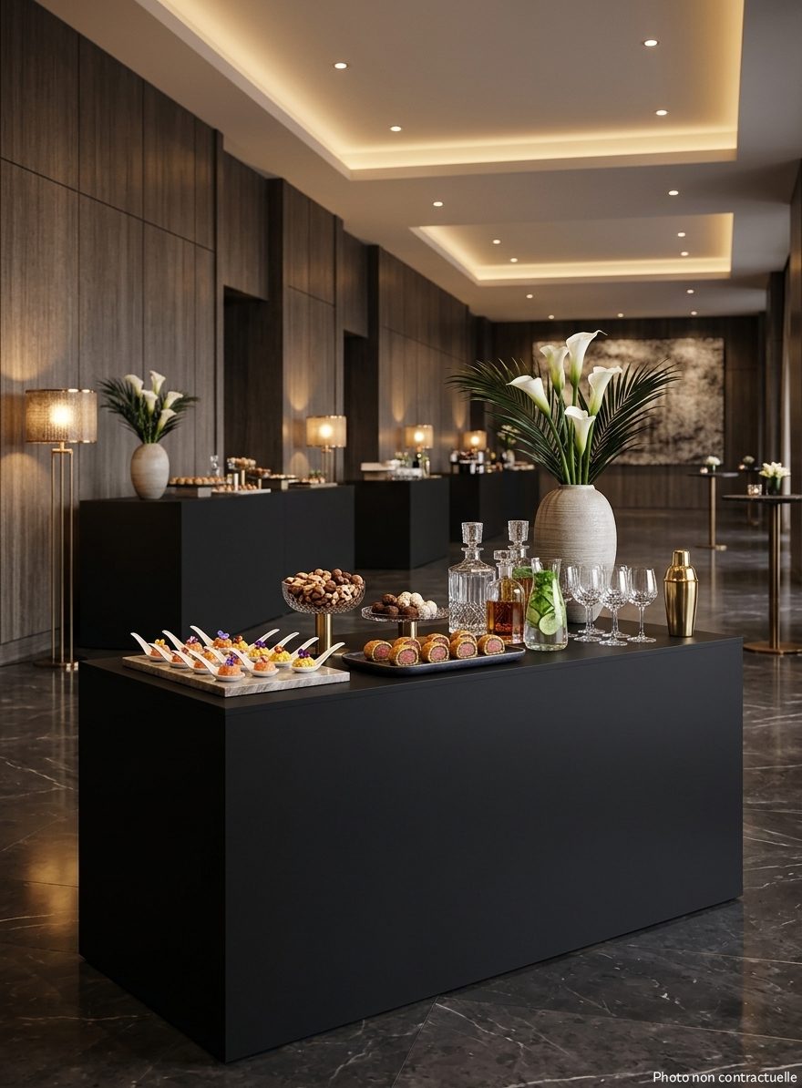 Buffet ZEKUB pliant 5 faces à 90°. Une structure en aluminium et un plateau basculant en contreplaqué renforcé aux quatre coins par des équerres métalliques. Montants, aux quatre angles, garantissant un houssage parfait au tendu «square». Ce buffet pliant s’installe, déployé et houssé, en moins de cinq minutes par une seule personne ! Tout en-un, il est très pratique. Il offre sous le buffet houssé un volume de stockage discret et utile. Zekub est une marque déposée de VIF.