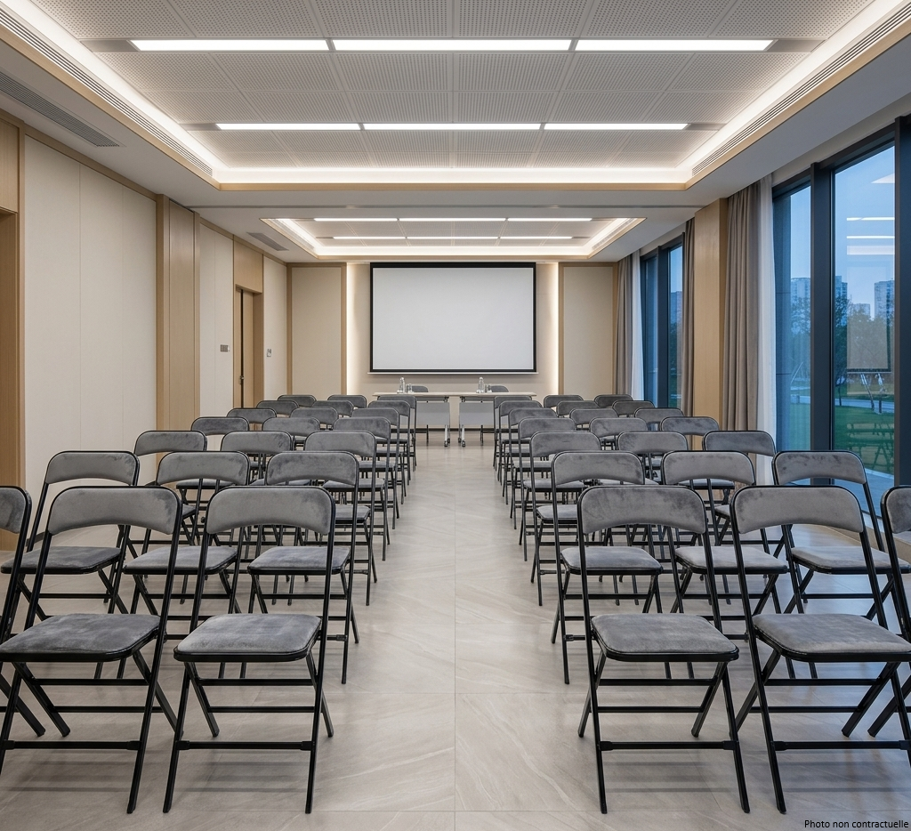 Cette chaise pliante tissu est attachable. Voir ses accessoires : crochet de liaison, barre inter-rangées, tablette écritoire, mais aussi chariot de transport CHARCAGE.
