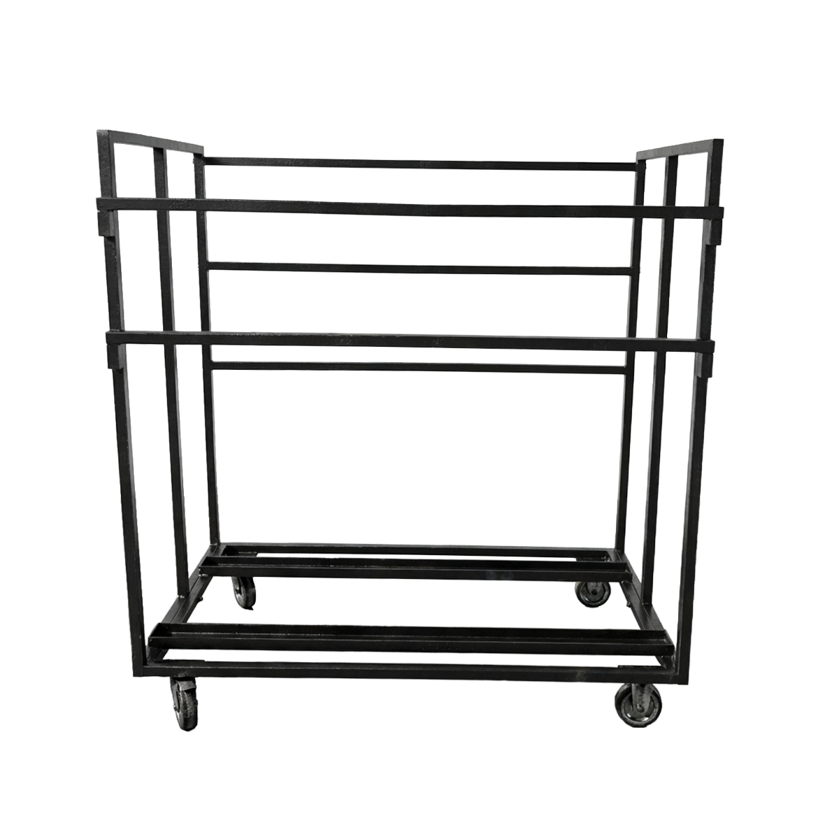 Chariot mange-debout pouvant stocker et transporter 17 mange-debout pliants en HDPE. Ce chariot accepte des diamètres de plateau allant jusqu'à 85 cm.