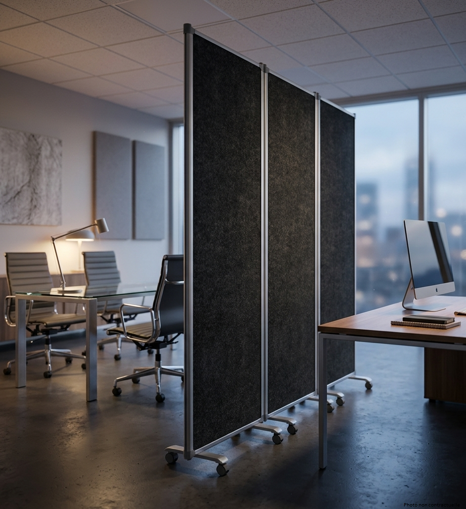 Cloison mobile sur roulettes avec une âme en matériau léger et rigide. Elle est recouverte d’un tissu acoustique gris foncé. Trois panneaux 60 x 180 cm. Les charnières ne laissent qu’un minimum d’écart entre les cloisons.