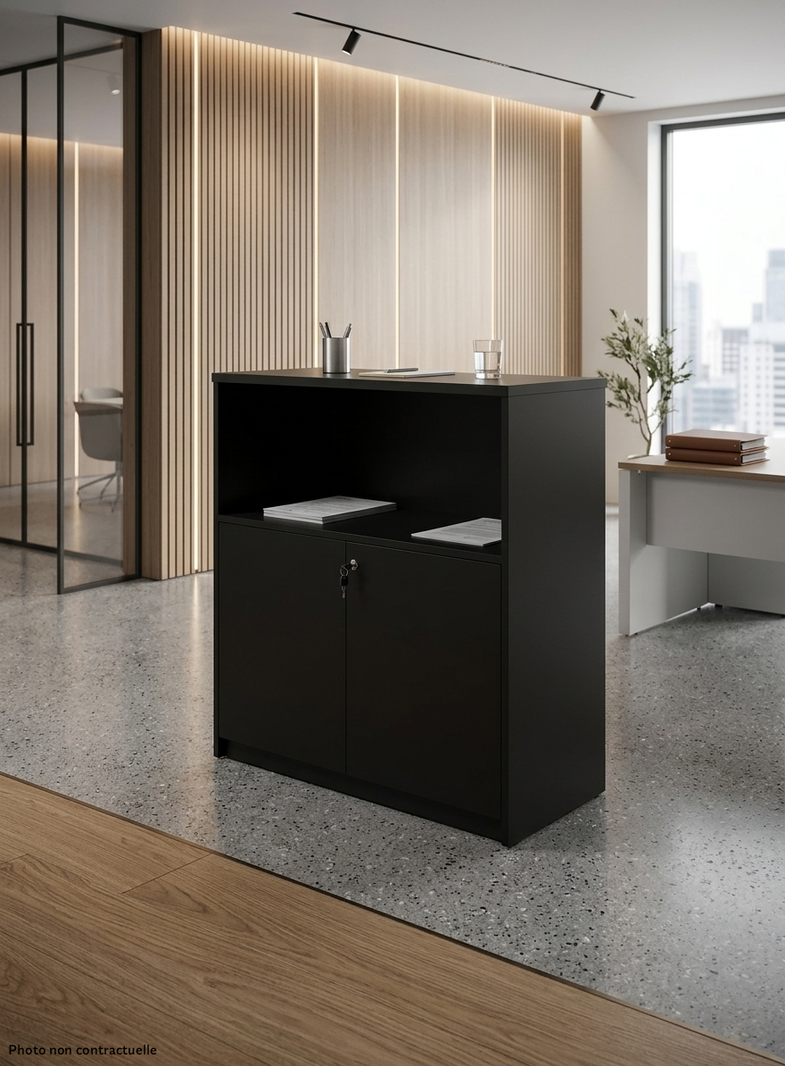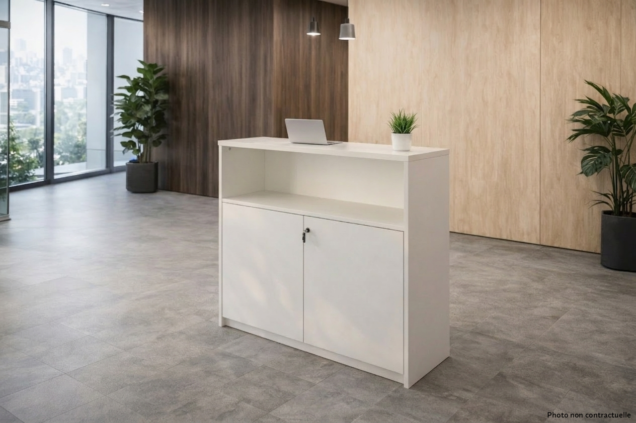 Comptoir d’accueil avec 3 niveaux de rangements. Deux sont sécurisés par des portes équipées d’une serrure à clé.