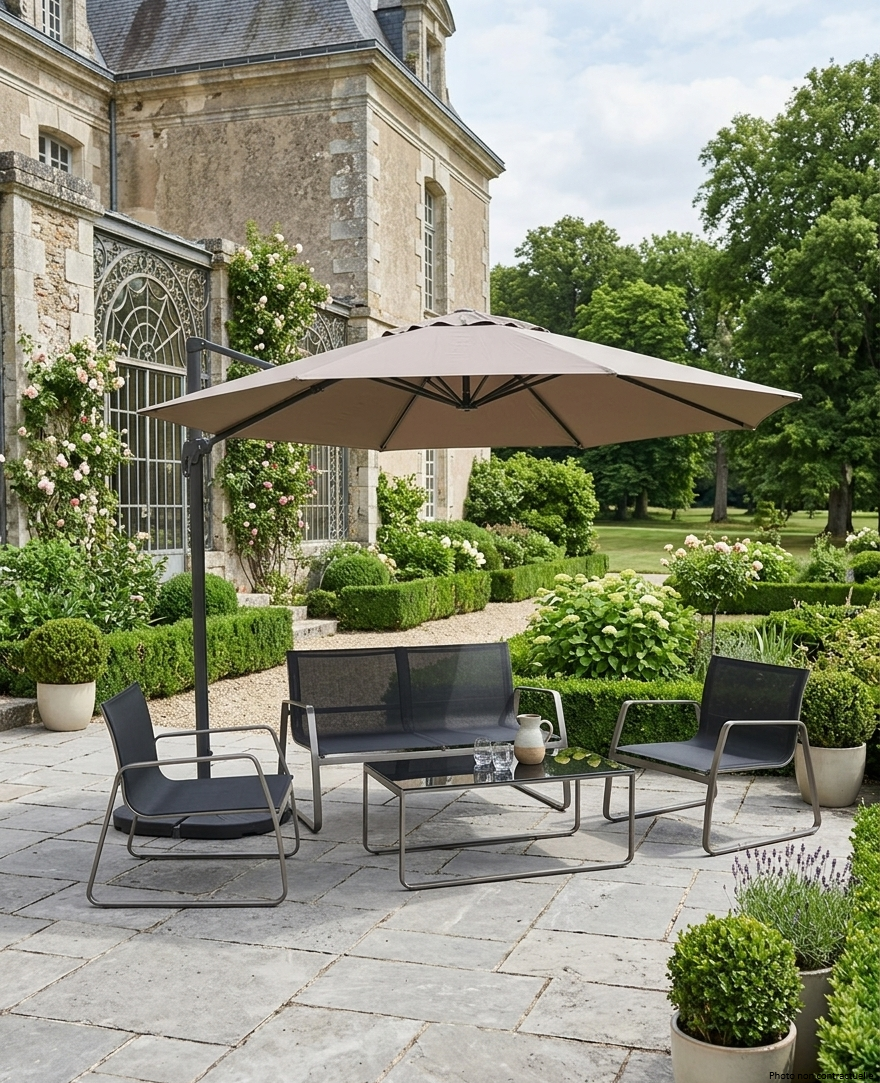Cet ensemble en textylène noir est idéal pour les événements en extérieur et convient parfaitement pour une terrasse, un jardin, une piscine, un camping.