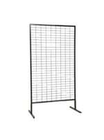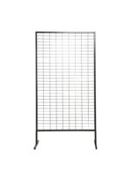 Grille d’exposition démontable en acier noir , la grille repose sur deux pieds également amovibles.