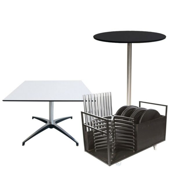 PACK 17 mange-debout pliants HDPE + housses blanches + chariot de transport