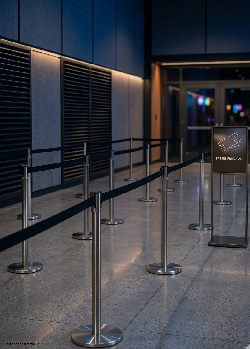 Potelet à sangle chrome rétractable reposant sur une base lestée à tête amovible par système de visse. Chaque tête de potelet est équipée d’une sangle rouge ou noir de deux mètres de longueur et de trois points d’accroche à 90°.