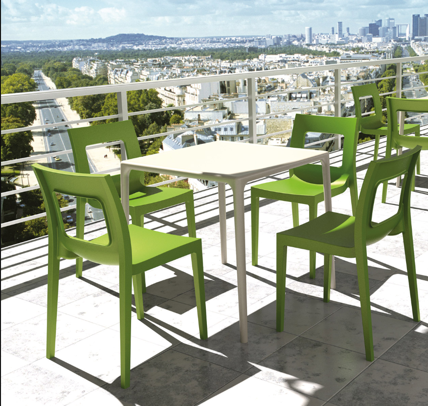 Table pour extérieur et terrasse en thermoplastique injecté. Une table empilable aux pieds démontables.
