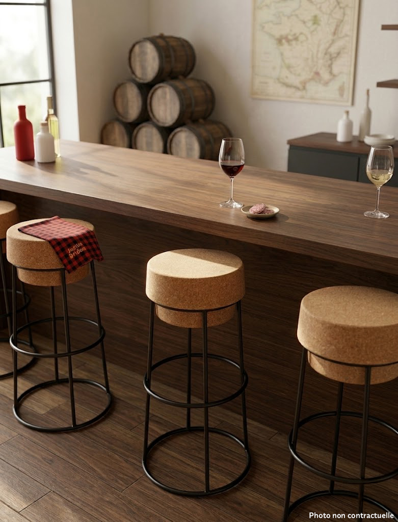 Tabouret de bar haut, cadre en acier noir, assise en liège